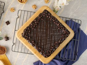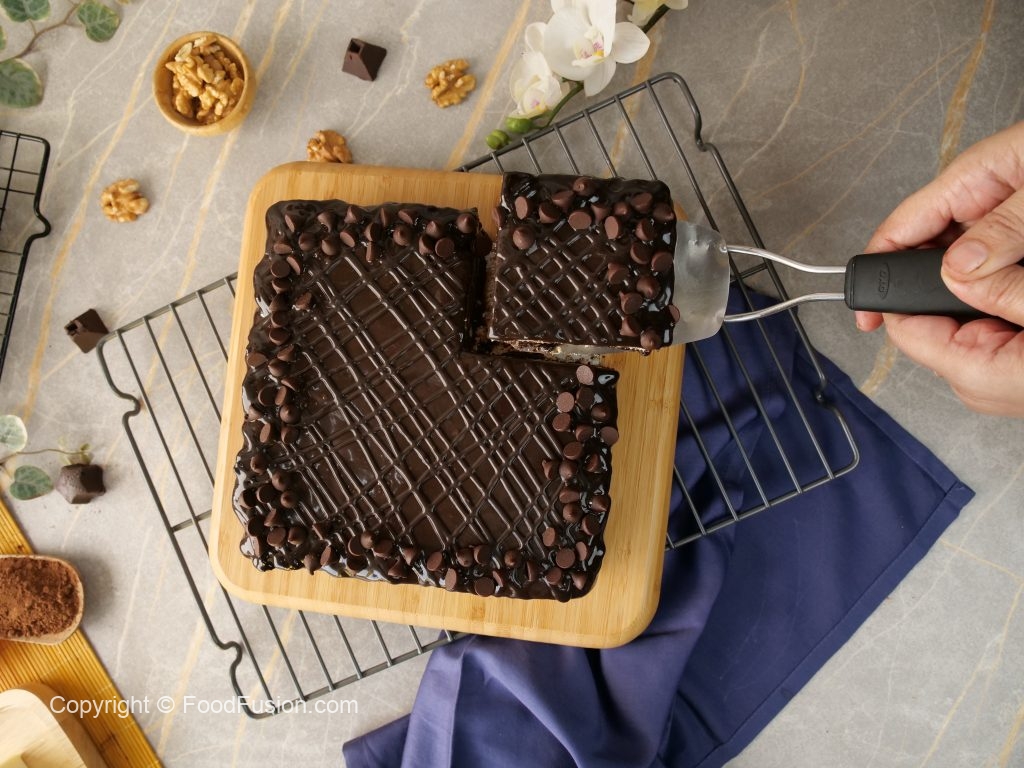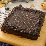 -Remove cake from cake pan,drizzle remaining chocolate ganache,chocolate chips & serve!