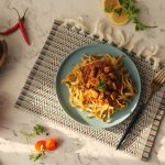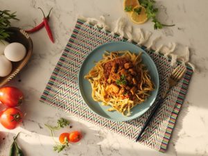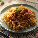 -Serving plate mein tayyar egg noodles,marinara sauce aur cooked chicken dal ker serve karein!