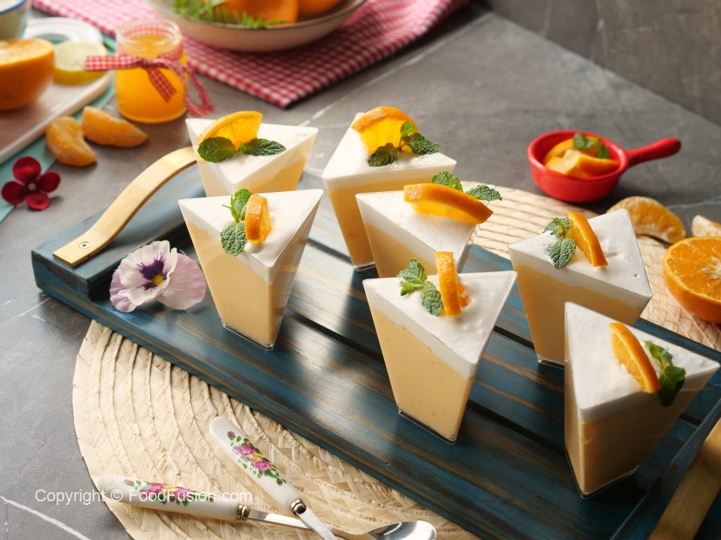 In serving cups,add a layer of orange mousse,whipped cream and scrape excess cream.