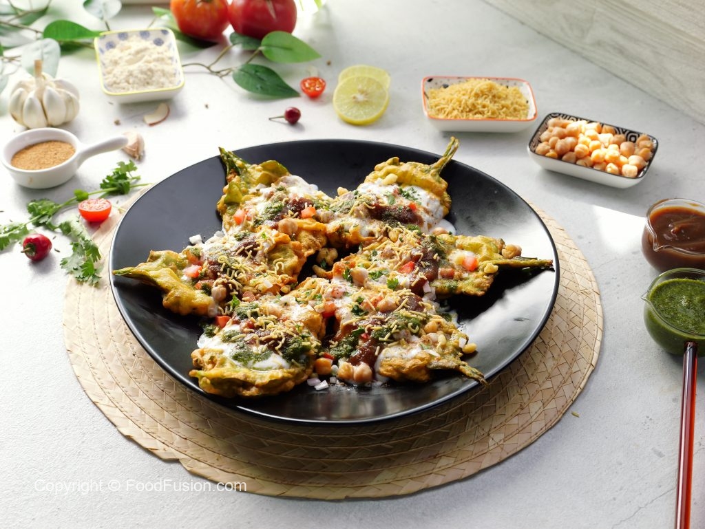 -Assemble fried palak patta on a platter,add chickpeas,bareek boondi,tomato,onion,yogurt,khatti meethi chutney,green chutney,sprinkle chaat masala,nimco sev & fresh coriander & serve!