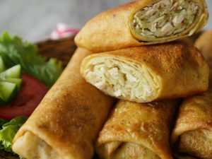 Take a prepared wrap,add chicken & cabbage filling,fold over the sides,roll up and apply all-purpose flour paste.