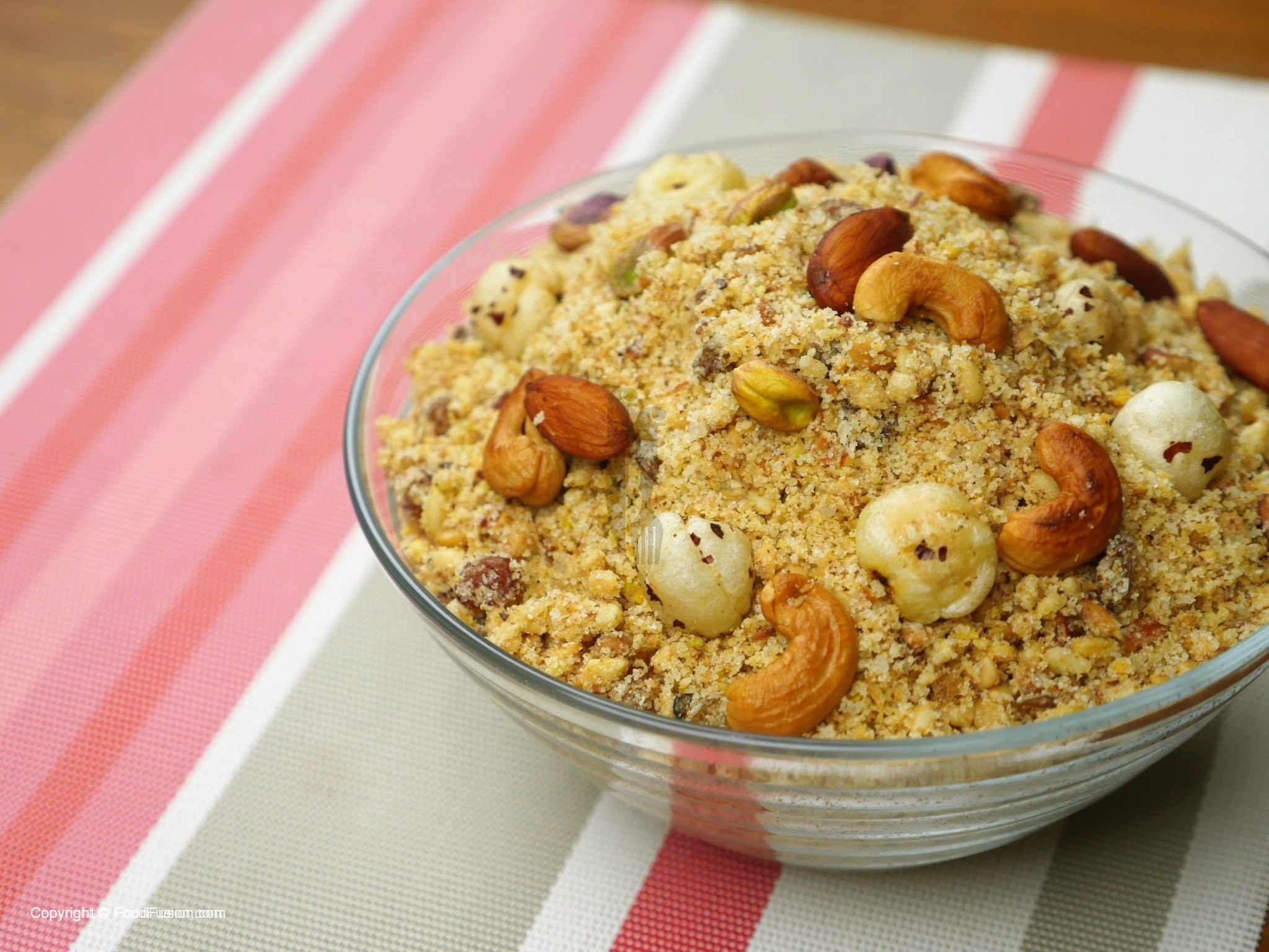 Bowl mein sooji mixture,coarsely ground fried nuts,char magaz & kishmish aur pisi huee cheeni dal ker ache tarhan mix ker lein.