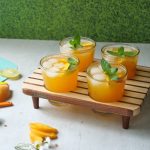 -Serving glass mein ice cubes,peach slices,tayyar peach drink aur podina dal kar serve karein!