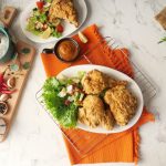 Serve crispy air fried chicken with sauce & salad.