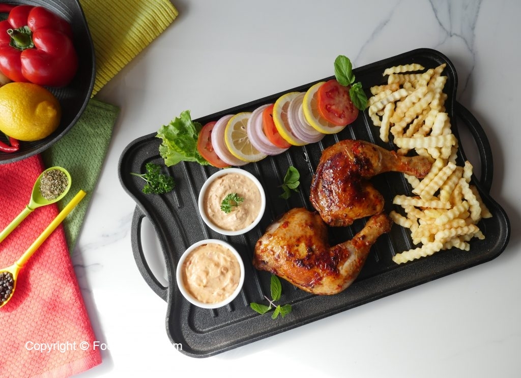 Grease frying pan with cooking oil,place marinated chicken pieces and cook on low flame from both sides until done (approx. 15-20 minutes) and basting with remaining marinade,cover and turn sides in between.