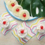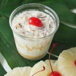 Sprinkle fresh coconut and top with cherry.