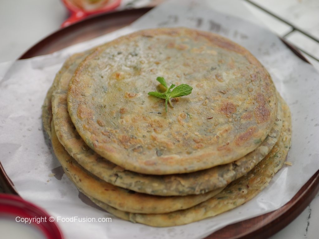 On heated griddle,place paratha,add ghee & fry paratha from both sides until done (makes 6).