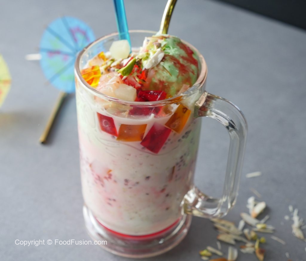 Serving glass mein falooda sev,tukh malanga,lal sharbat,tayyar rabri doodh,yellow jelly,red jelly,pista ice cream scoop,falooda sev,tukh malanga,pineapple chunks,red jelly,yellow jelly,lal sharbat,badam aur pista dal ker serve karein.