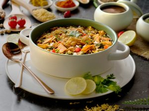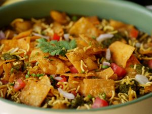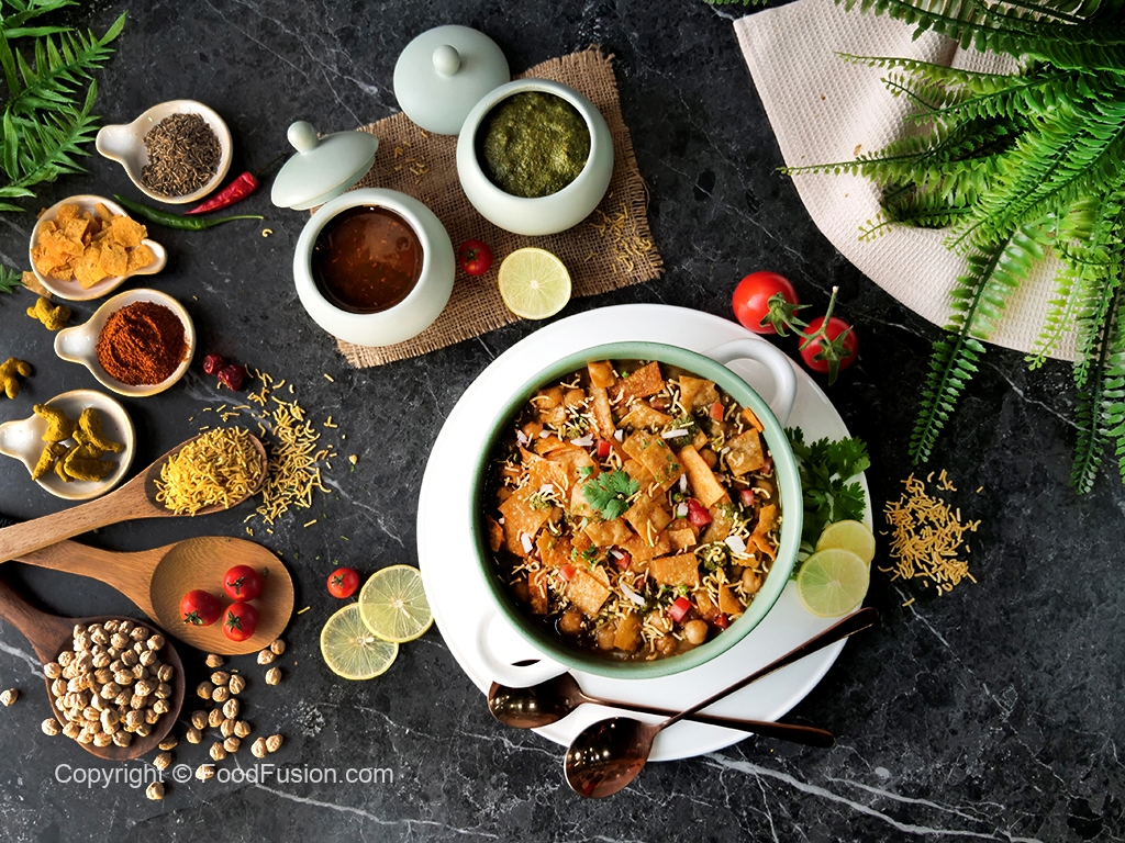 In a serving dish,add ragha chaat,onion,tomato,green chilli,spicy green chutney,tamarind sauce,sev nimco,papri,fresh coriander,chaat masala & serve!