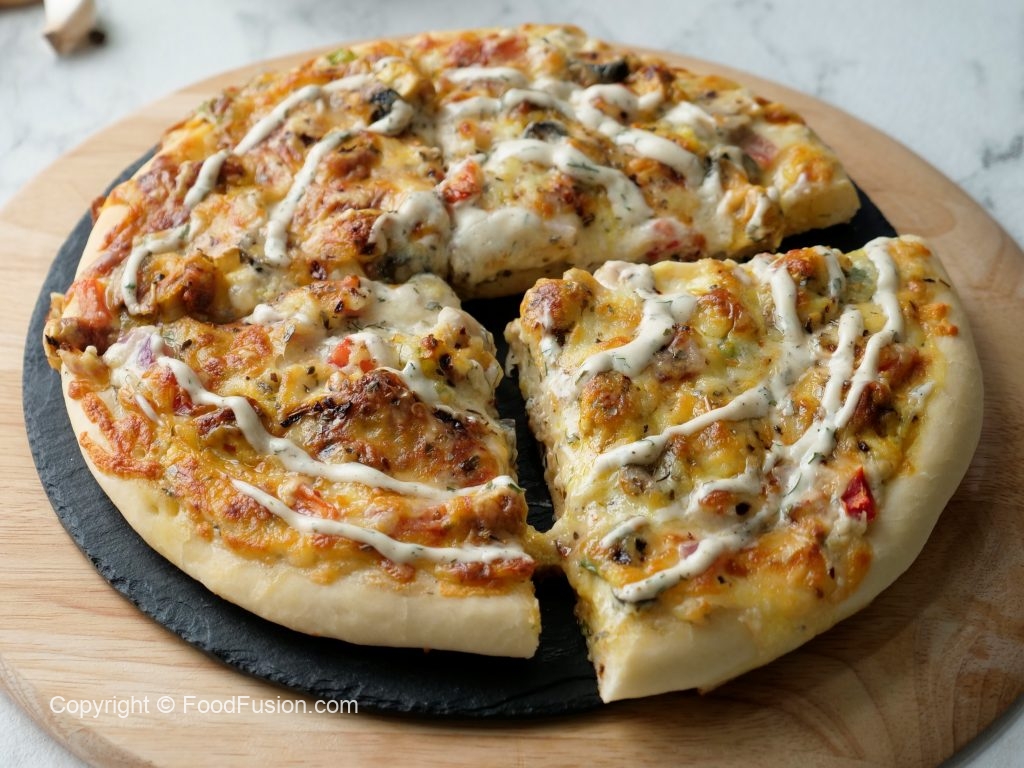 Ranch sauce 3-4 tbs dal ker pheela lein,cheddar cheese,mozzarella cheese,cooked chicken,shimla mirch,pyaz, tamatar,mushrooms,black olives,black olives,cheddar cheese,mozzarella cheese,dried oregano aur lal mirch crushed dal dein (makes 3 medium Pizzas).