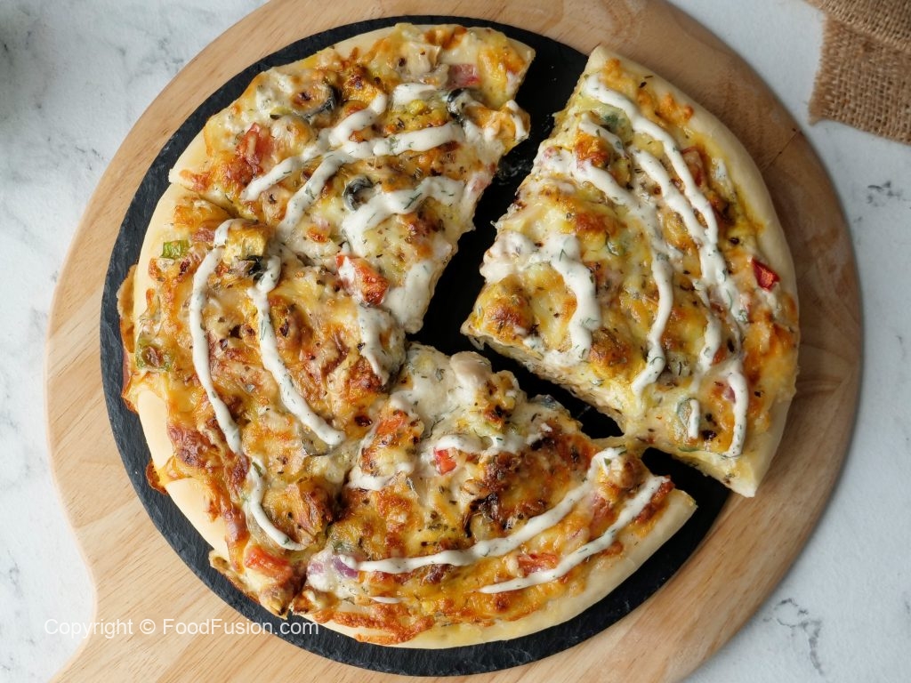 Pizza ko oven sa nikal lein aur ranch sauce ko drizzle ker lein phir slices mein cut lein & serve karein!