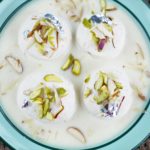 Place cheese balls on serving plate, pour sweet milk (rabri).