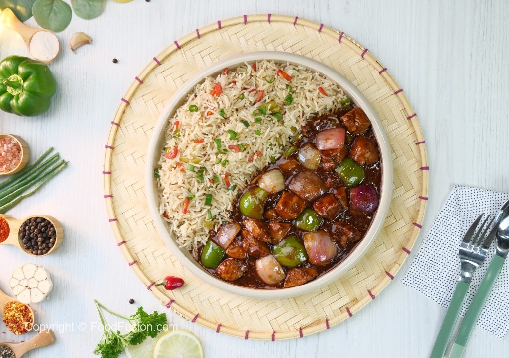 -Serve spicy Schezwan chicken gravy with fried rice!