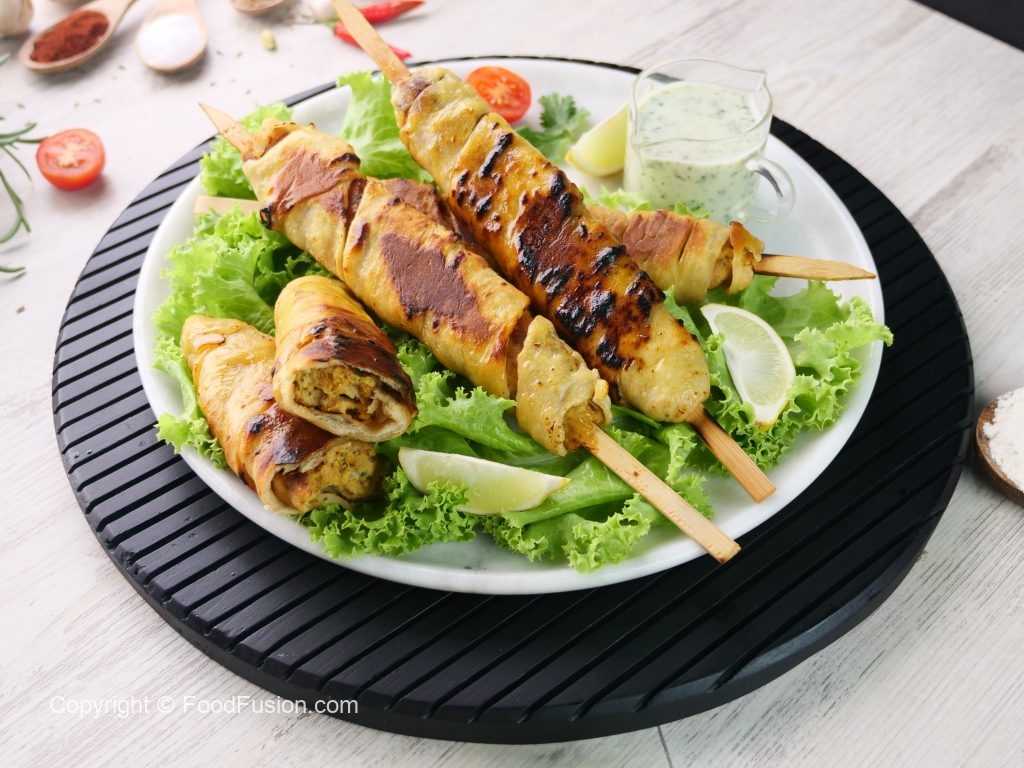 -Heat griddle & cook wrapped skewers on low flame from all sides until golden then fire roast on direct flame until its charred from all sides.