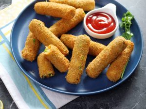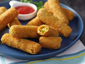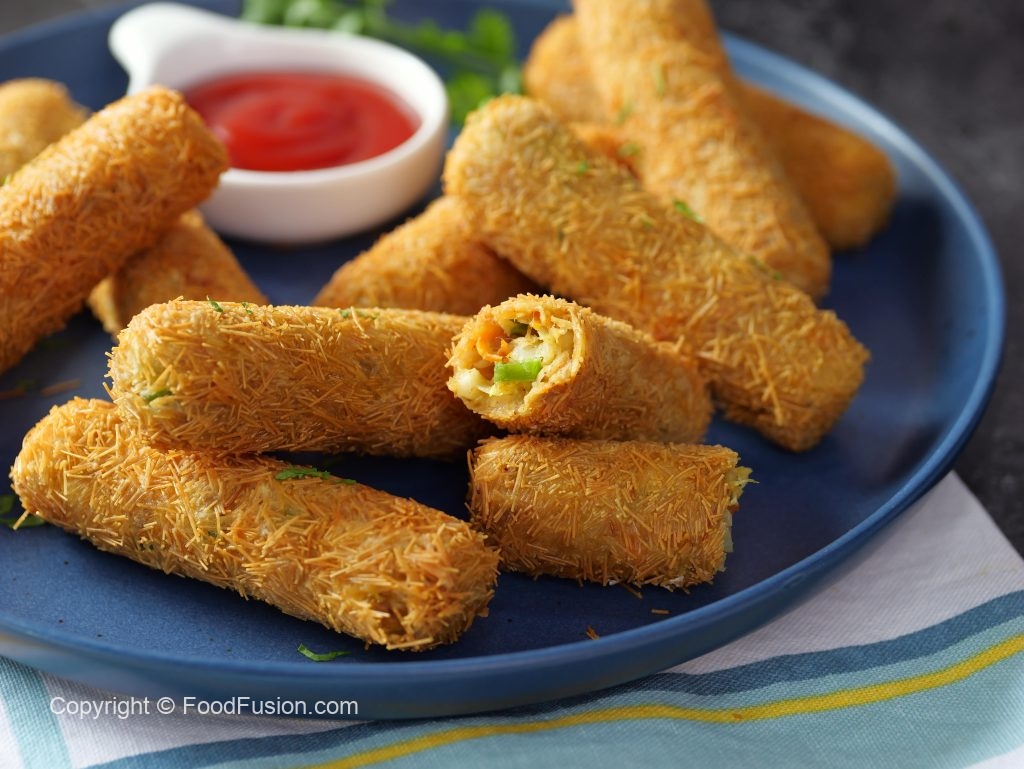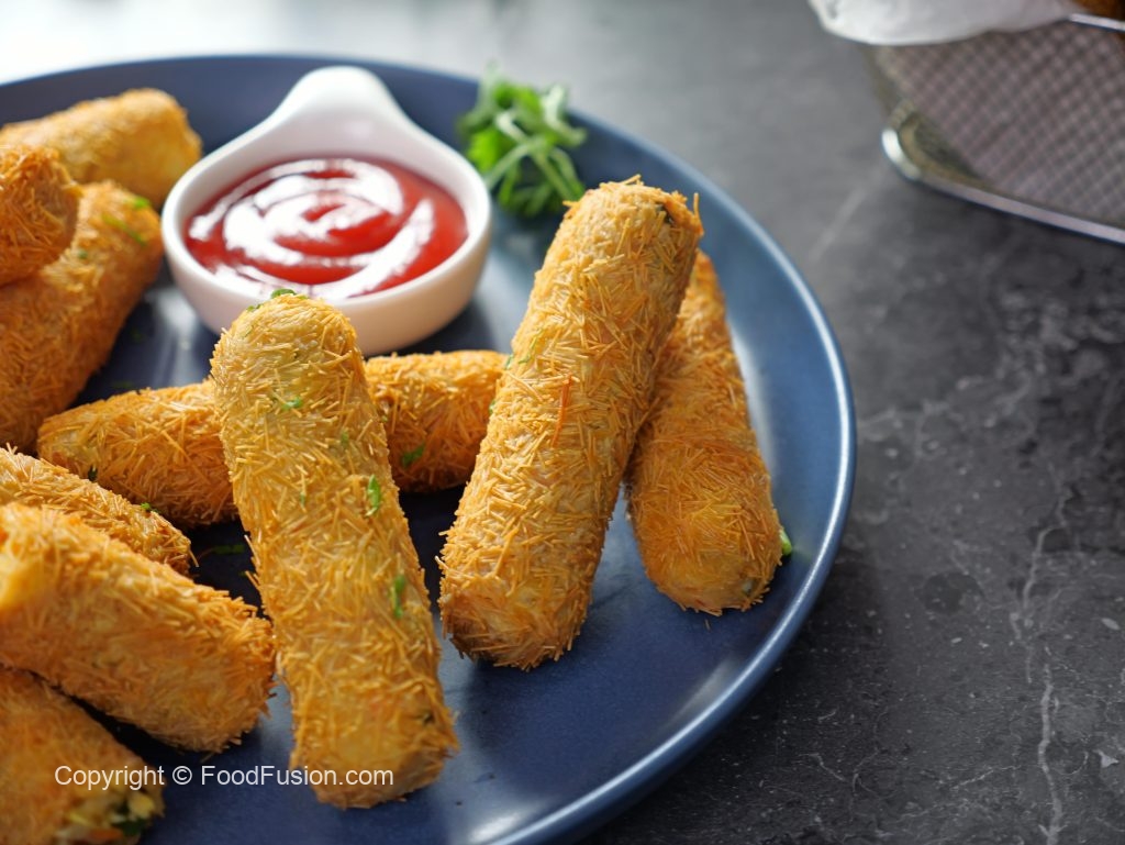 -Grease hands with cooking oil,take 40g of mixture & make finger shape kabab then coat with all-purpose flour,dip in whisked egg & coat with vermicelli (make 24-25).