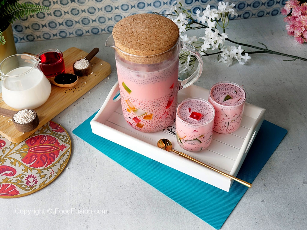 In a jug,add ice cubes,coloured jelly cubes,cooked tapioca sago,soaked basil seeds & prepared milk,mix well & serve!