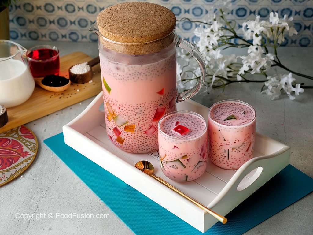 Jug mein ice cubes,colored jelly cubes,cooked sabudana,soaked tukhme balanga & tayyar doodh dal ker ache tarhan mix ker lein & serve karein!