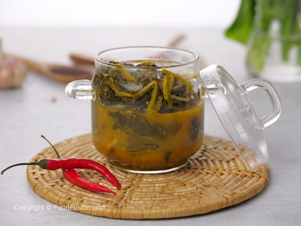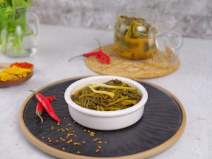 -In a jar, add boiled mustard leaves, green garlic, pink salt, red chilli powder, turmeric powder, mustard seeds, cover & shake until well combined.