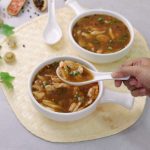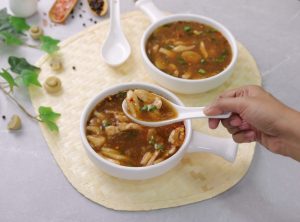 -In serving bowl,add red chilli crushed,soy sauce,sesame oil,soup,green onion leaves & serve!