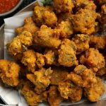 -Bowl mein chicken,pink salt,lal mirch crushed,sabut dhania,zeera,ajwain,lal mich powder,garam masala powder,lemon juice,zarda ka rang,baking soda,baisan,chawal ka atta,til,hara pyaz aur hara dhania dal dein.