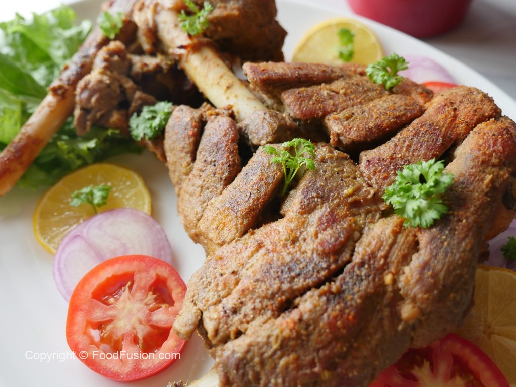 Baking tray per aluminum foil aur butter paper laga ker marinated mutton leg rakh ker marinade dal dein aur foil ko properly seal ker lein.