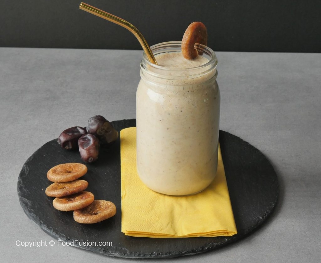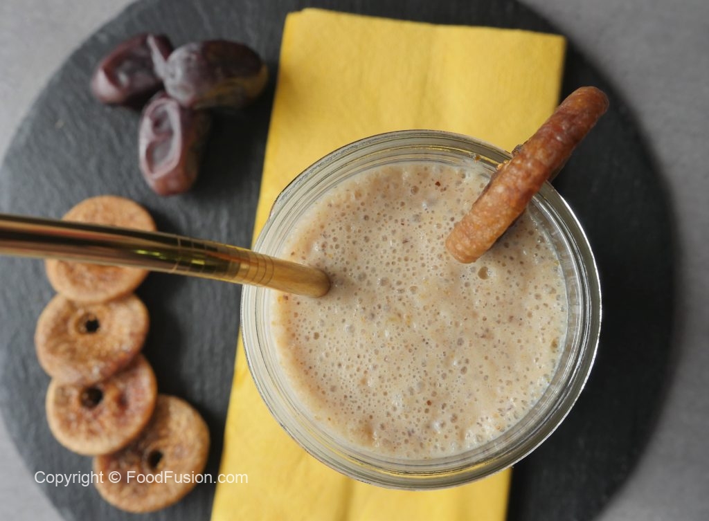 In blender,add soaked figs+dates+milk,ice cubes and blend until well combined.