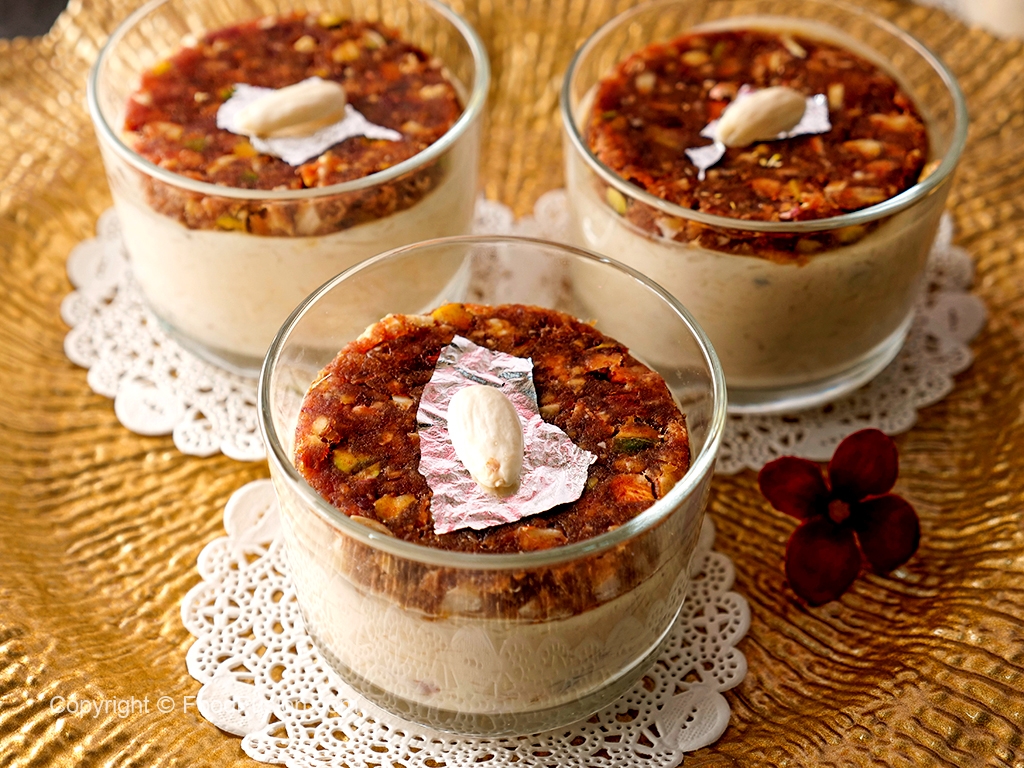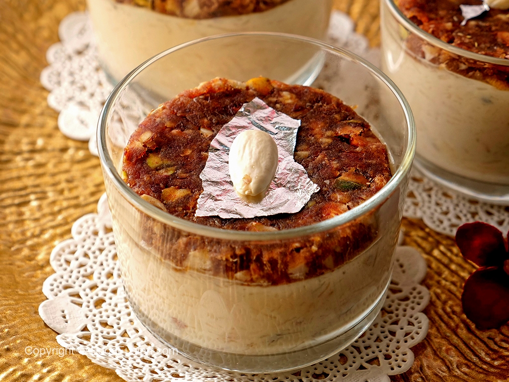 In a serving glass,add prepared sheer khurma then carefully place prepared date mousse disc over it.