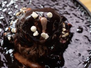 -Heat sizzler pan,place brownie,belgian chocolate ice cream & pour prepared chcoolate sauce.