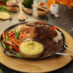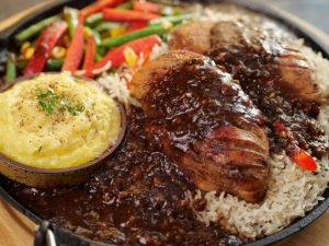 -Garlic fried rice,stir fried vegetables,creamy mashed potato,chicken fillets,garlic & pepper sauce dal ker serve karein!