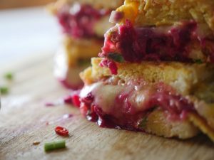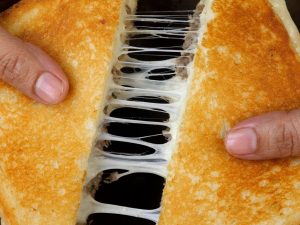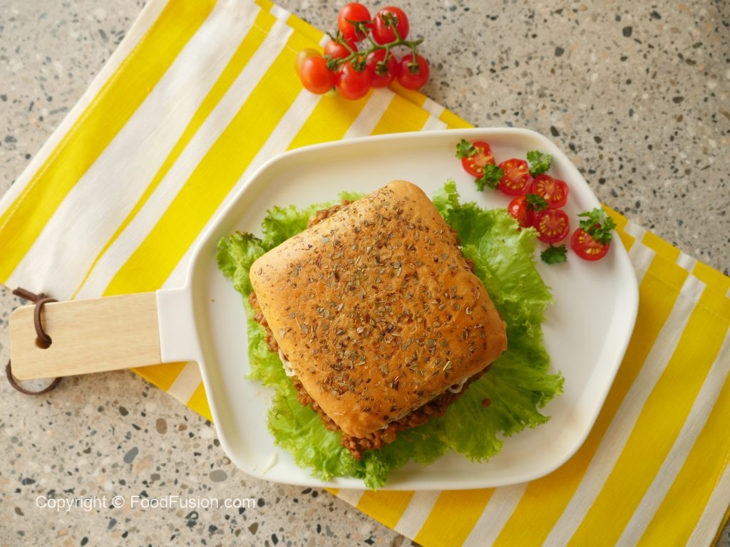Add cheddar cheese,cooked beef filling,mozzarella cheese and top with another bun (makes 3-4).
