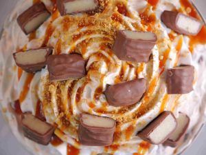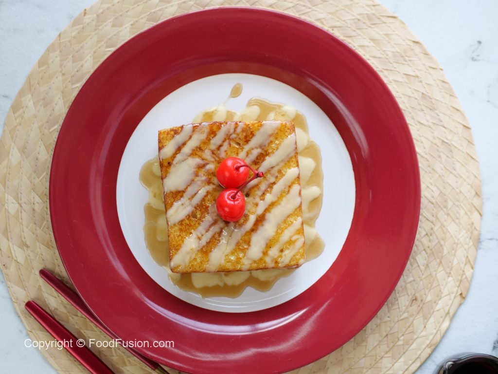 -On french toast,drizzle vanilla cream sauce,pancake syrup,garnish with cherries & serve!