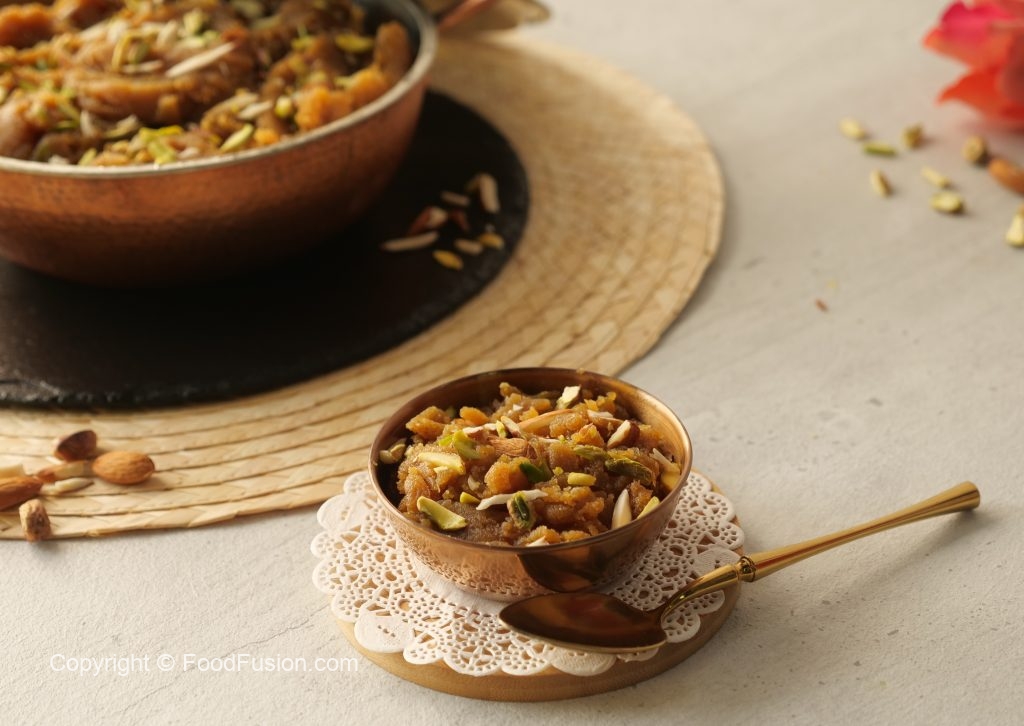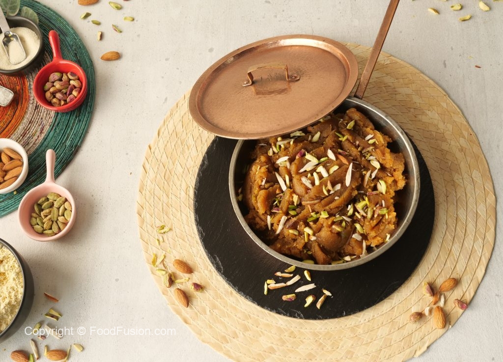Tayyar sheera dal kar achi tarah milayen aur halki ancch per ek saath ho janay & ghee alag ho janay tak paka lein (8-10 minutes) aur musalsal mix kertay rahein.