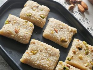 Sprinkle desiccated coconut, pistachio and almonds and cut in squares.