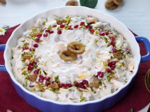 -In a serving dish,add prepared cream fruit chaat & garnish with pistachios,almonds,fig,pomegranate,fig & serve!