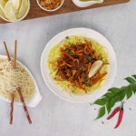 -In a serving plate,add spaghetti,prepared curry,beef currry,chips,fried garlic,fried onion,fresh coriander, lemon juice,chaat masala,lemon & serve!