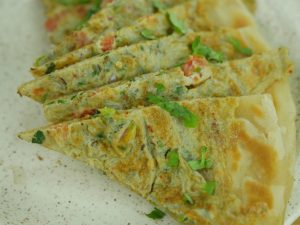 In jug,add eggs,onion,tomato,green chili,fresh coriander,red chili crushed,salt,cumin seeds and coriander seeds,whisk well & set aside.