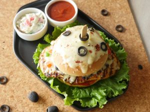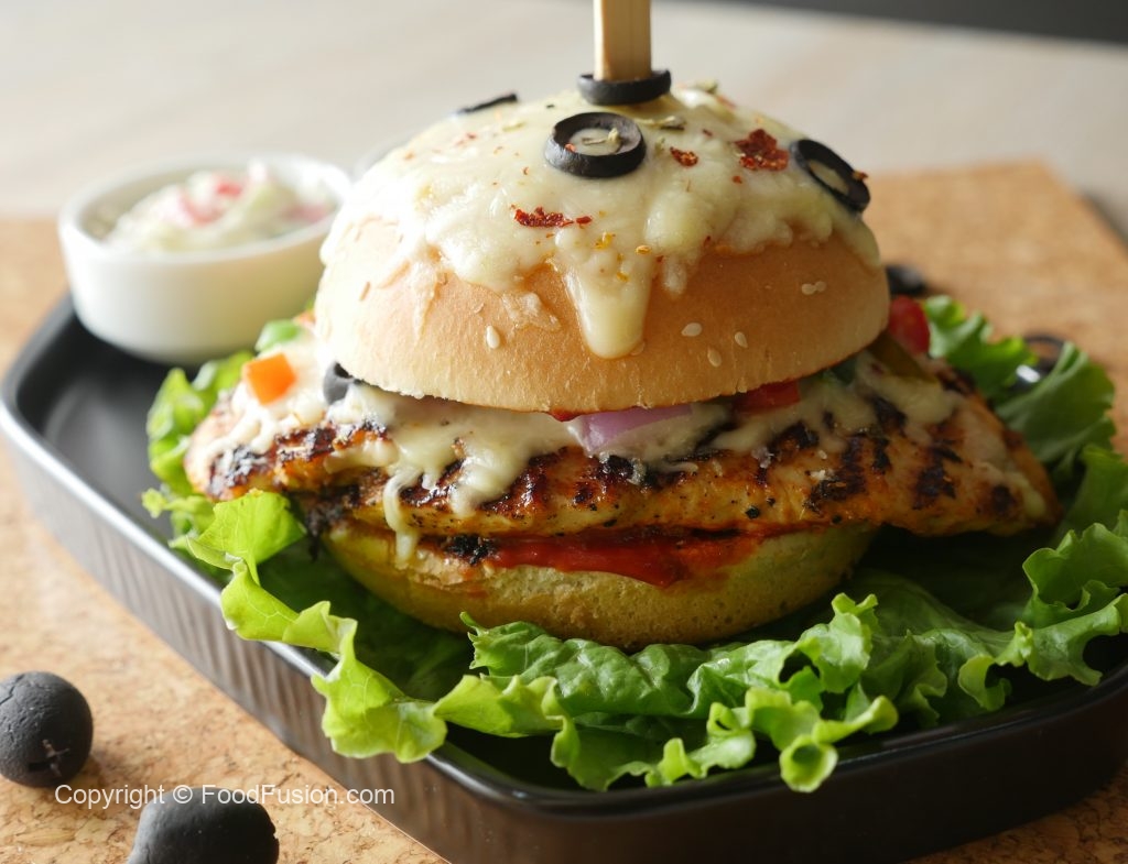 On burger bun,add & spread pizza sauce,place cooked chicken fillet,cheddar cheese,mozzarella cheese, onion,capsicum,tomato,jalapenos,black olives,dried oregano and red chili crushed.