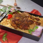 -In a serving platter,add garlic rice,spicy chicken roast ,fried garlic,fresh parsley,onion rings,roasted veggies & serve!