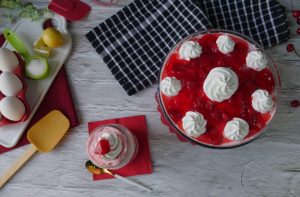 Garnish with reserved whipped cream & prepared strawberry jello.
