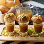 Poke gol gappa from the center,add chickpeas,potato & whole green gram,spicy green chutney,yogurt, prepared meethi chutney,sprinkle chaat masala,nimco sev & serve with prepared minty khatta pani!