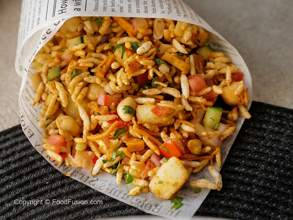 In a bowl,add roasted puffed rice,cucumber,onion,chickpeas,tomato,potato,green chilli,ginger,nimco mix,pickled oil,prepared spice mix,fresh coriander,lemon juice & mix well.