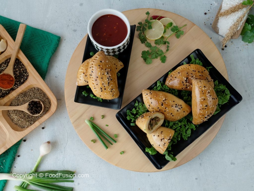 Dough ko ek side per tayyar filling 2 tbs dal dein aur dough ki side ko fold ker ka d-shape bana lein aur fork ki madad sa edges ko seal ker lein (makes 12).