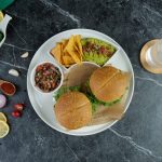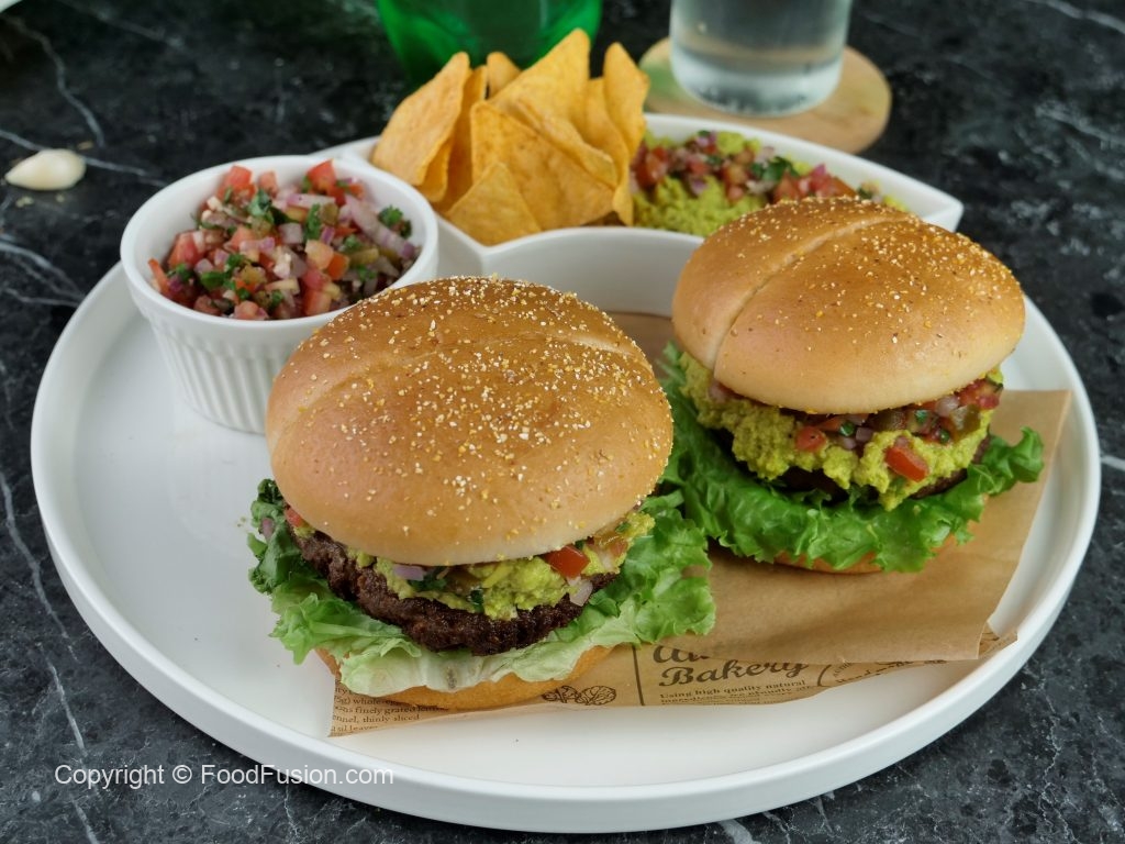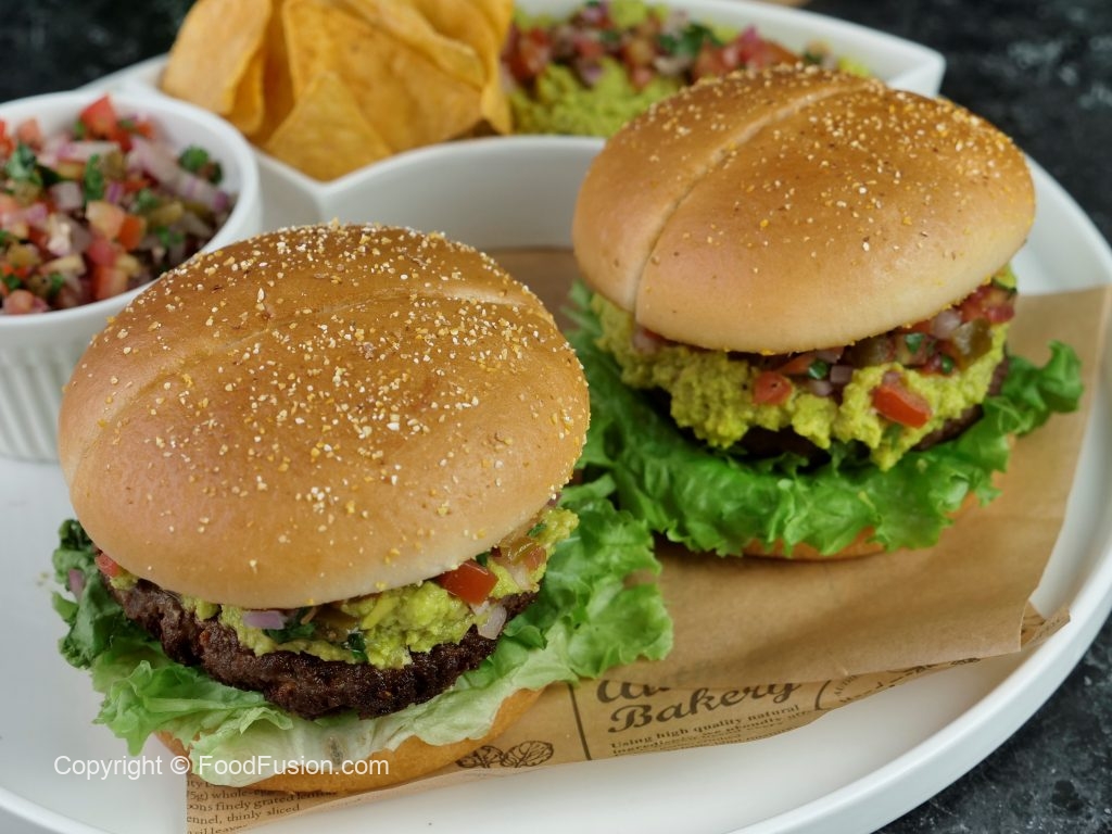 On burger bun per sour cream dal ker pheela lein,salad patta,guacamole aur salsa dal ker upper sa top bun rakh dein.