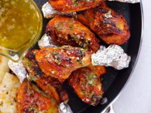 -Brush prepared garlic mint butter sauce on chicken drumsticks & serve with naan!