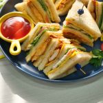 -Three bread slices per tayyar sauce,tandoori chicken pieces aur cheese slice dal ker flip ker lein phir tayyar sauce,salad patta,pyaz,tamatar,kheera aur cooked anda dal dein aur bread slice ko flip ker ka sandwich bana lein.