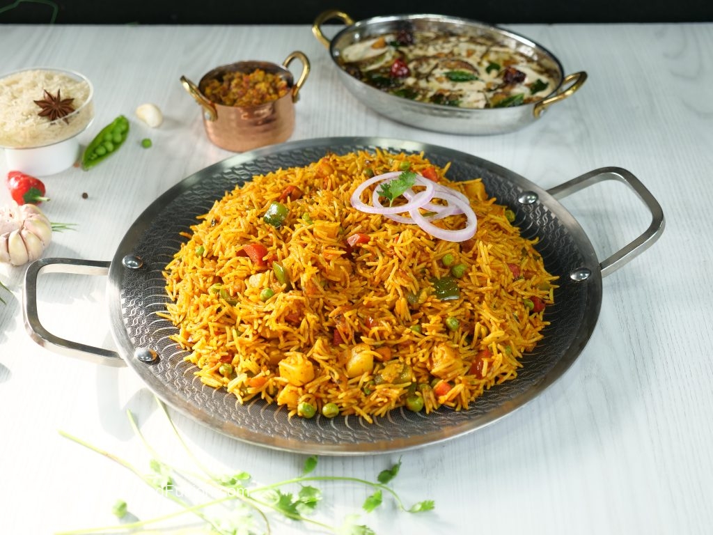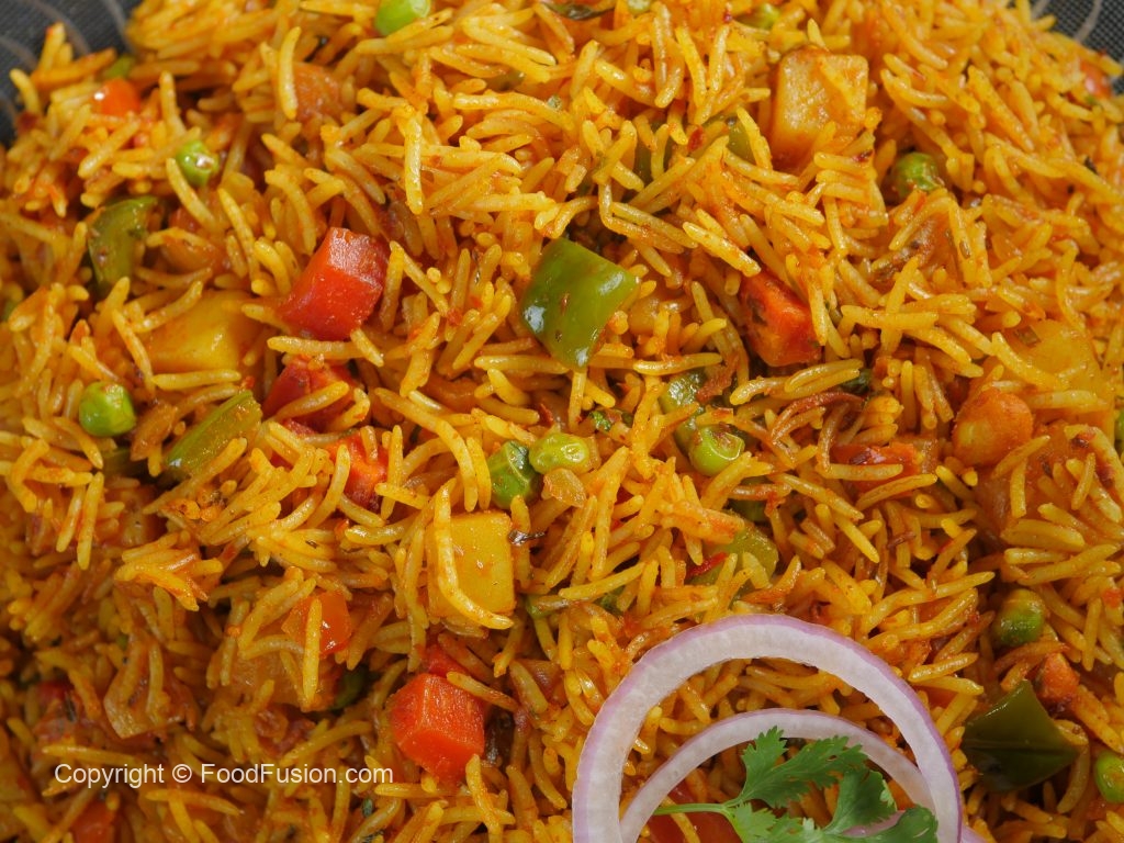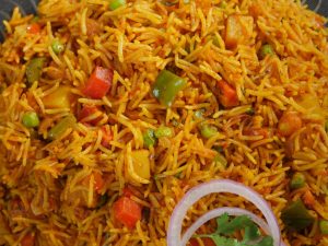 -Garnish tawa veg pulao with onion rings & serve with zucchini dahi.