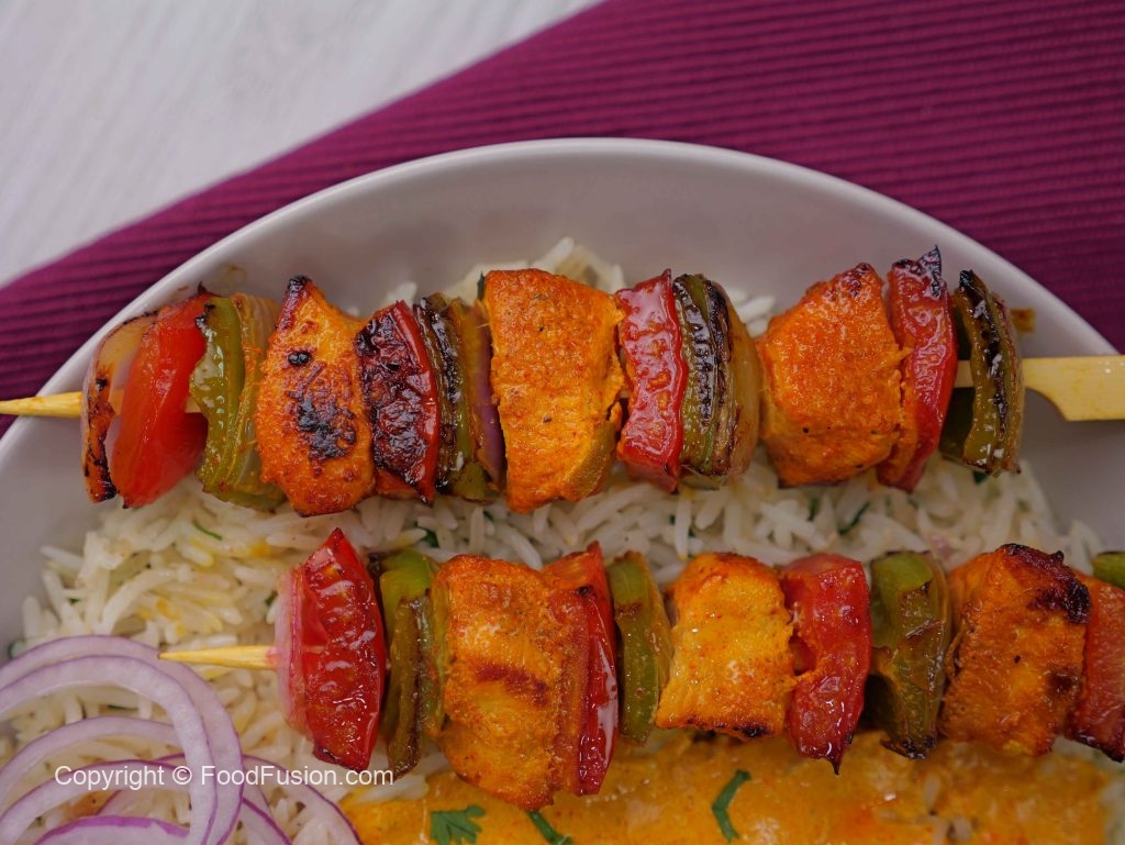 -Thread onion,capsicum,tomato & marinated chicken in a wooden skewer repeat steps 2 times more. (Makes 10-12) & reserve remaining marinade for later use.