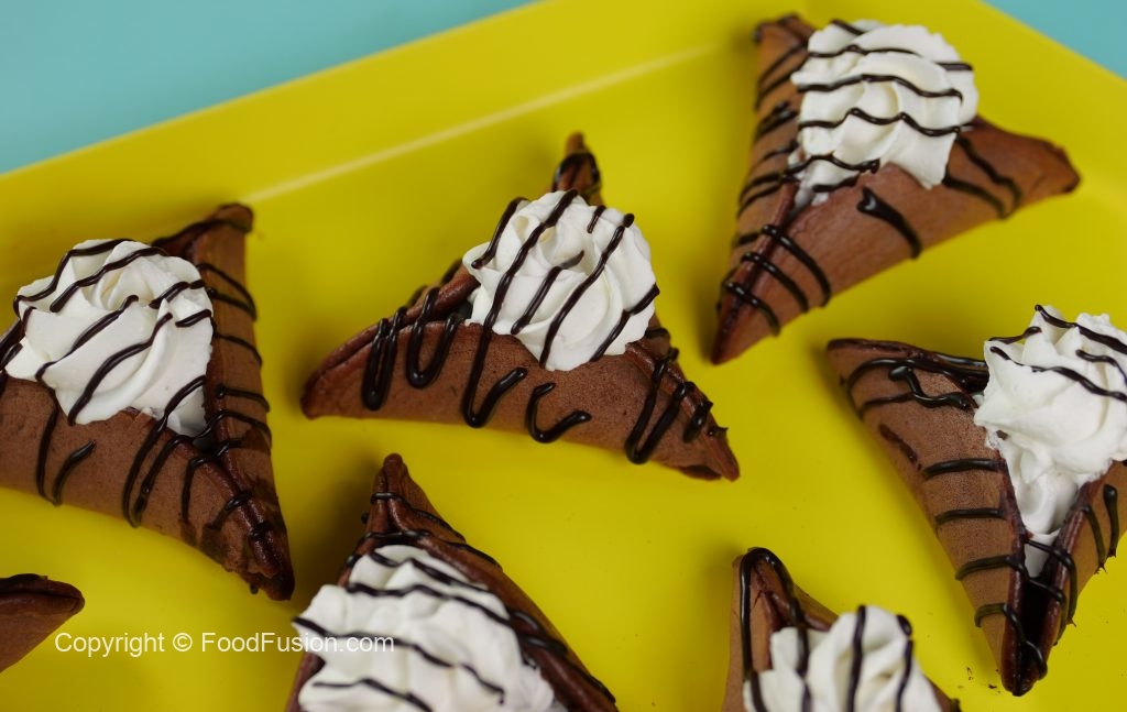 -Pancake ko baking paper per rakh dein aur corners ko fold ker ka triangle shape bana lein aur few seconds kliya hold karein ta ka stick ho jaye (makes 11-12).