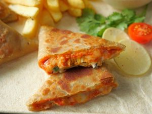 -Add & spread pizza sauce,mix cheese,cooked chicken,onion,capsicum,black olive,prepared mayo sauce & fold into a triangle shape & apply water to seal the edges.