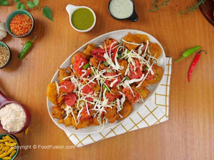 -Serving platter mein fried pakoray, fried tamatar aur hari mirch ke slices, achar dalein, band gobhi se garnish karen aur serve karen!